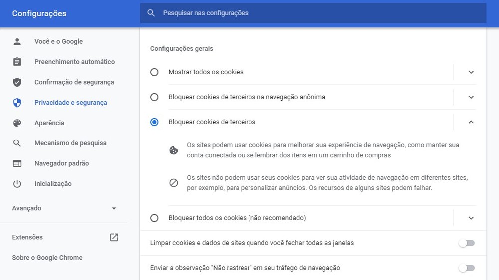 Além das configurações para cada site, é possível mudar preferências em navegadores para restringir cookies de terceiros. Veja como limitar cookies de terceiros nos dois programas: