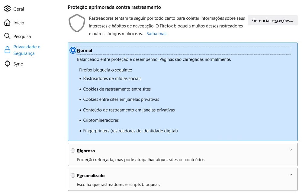 No Firefox, o bloqueio contra cookies de terceiros é ativado por padrão, mas é possível verificar se ele realmente está habilitado ao acessar a área de privacidade. Veja como fazer: