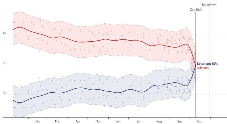 A revista inglesa The Economist divulgou nesta segunda-feira (10) a informação de que o presidente Jair Bolsonaro (PL) e o ex-presidente Luiz Inácio Lula da Silva (PT) estão empatados nas intenções de voto para o segundo turno, cada um com 50%.