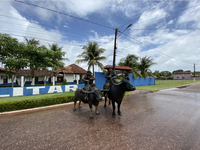 O 8º Batalhão da Polícia Militar do Pará, em Soure, é o único do país a adotar o uso de búfalos como modalidade de policiamento. Doados por fazendeiros, os animais chegam ao batalhão ainda pequenos para se adaptarem ao local e aos agentes de segurança.