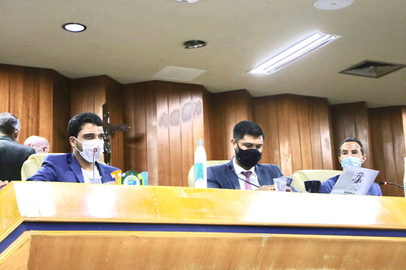 Ao convidar Marden Júnior para um lugar na mesa do plenário da Câmara Municipal, o presidente Romário Policarpo e o vereador Ronilson Reis receberam a placa comemorativa dos 101 anos de Trindade.