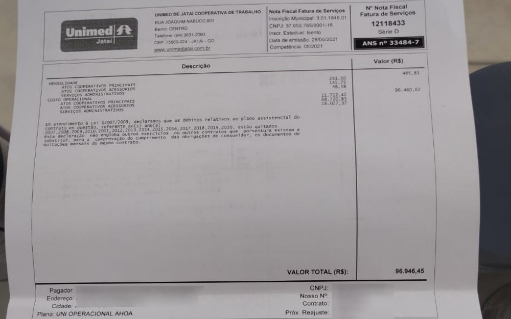 “O total ficou em mais de R$ 100 mil, e o plano já pagou pela parte que cobria. É um plano empresarial que não cobre UTI, a gente esperava um valor, mas não o dobro. Além de vivenciar o luto, ainda temos que pensar numa dívida dessa altura. É muito difícil”, explicou Janaína.