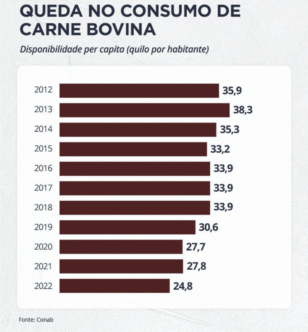 A quantidade de carne bovina consumida no mercado interno brasileiro em 2022 é a menor em 26 anos, de acordo com projeção da Conab (Companhia Nacional de Abastecimento), vinculada ao Ministério da Agricultura, Pecuária e Abastecimento, publicada na segunda-feira (1º).
