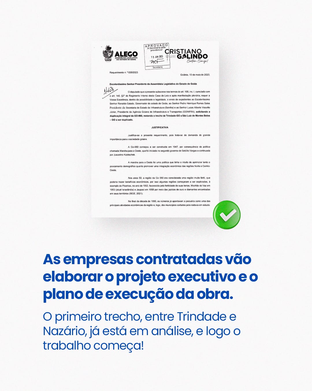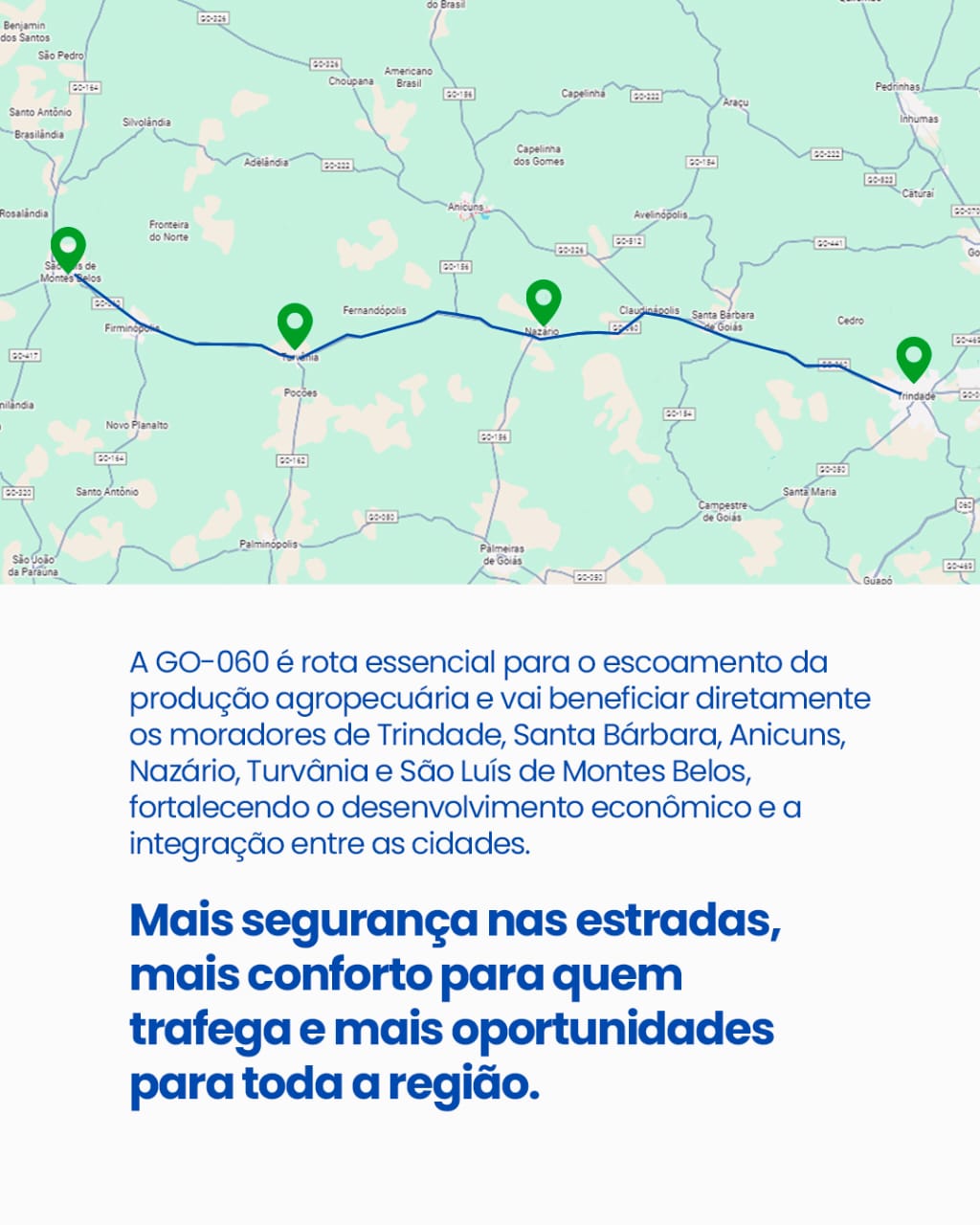 “Desde o início do meu mandato, lutei pela duplicação da GO-060, um sonho antigo que agora começa a se tornar realidade. Serão mais de 54 km de novas pistas, ligando Nazário, Turvânia e São Luís de Montes Belos, e beneficiando também Trindade, Santa Bárbara e Anicuns, Seguimos firmes, trabalhando por um futuro com mais progresso e dignidade para todos!”, disse o deputado.
