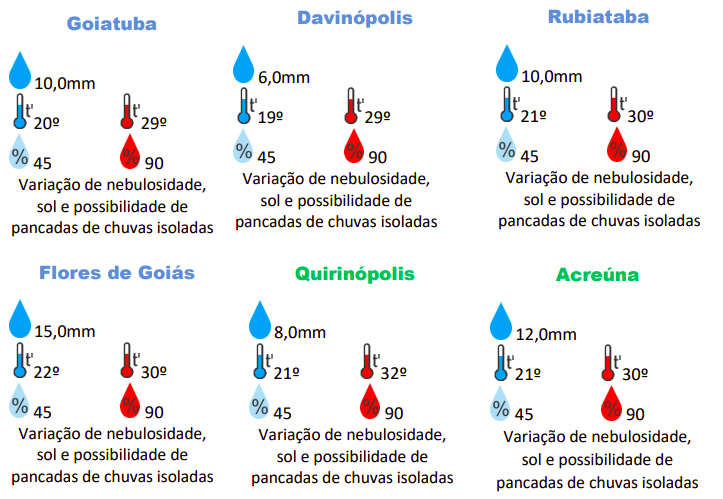 As regiões Leste, Sudoeste e Central de Goiás são as que enfrentarão as menores temperaturas, com mínimas de 18ºC e 19ºC, respectivamente. Já nas regiões Oeste, Norte e também Sudoeste, o calor pode checar a marcar aos 33ºC.