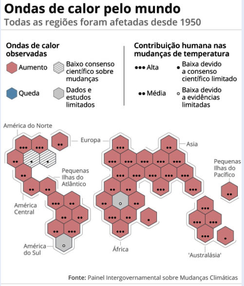2. As ondas de calor se tornaram mais frequentes e mais intensas em quase todos os continentes do planeta desde 1950, enquanto frios extremos se tornaram menos frequentes e menos severos;