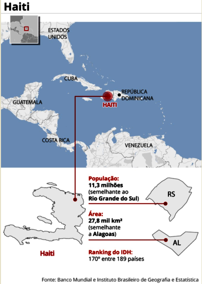 O Haiti tem 11,3 milhões de habitantes, faz fronteira com a República Dominicana na ilha Hispaniola, no Caribe, e tem um dos menores IDHs (Índice de Desenvolvimento Humano) do mundo: 0,51.