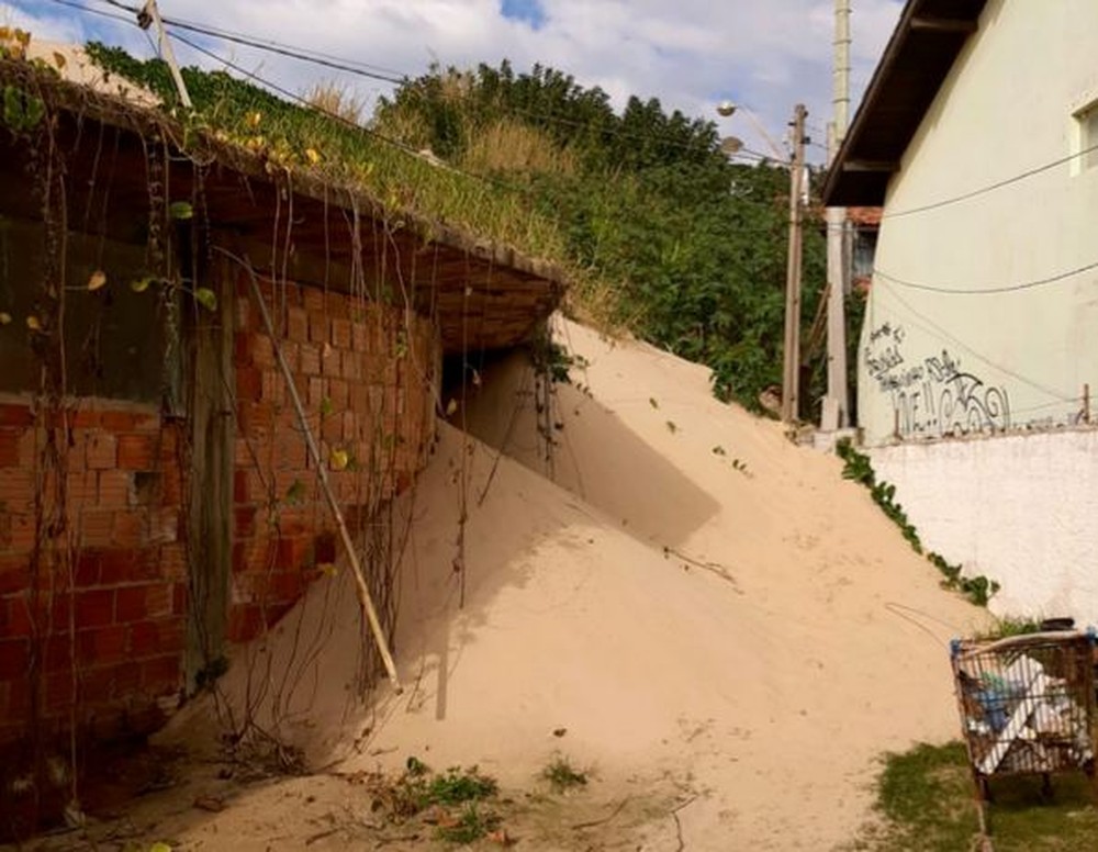 Além da residência, a areia também atingiu a Servidão Fermino Manoel Zeferino, bloqueando a passagem de veículos e dos moradores. Até um muro que fazia a proteção entre a rua e as dunas caiu.