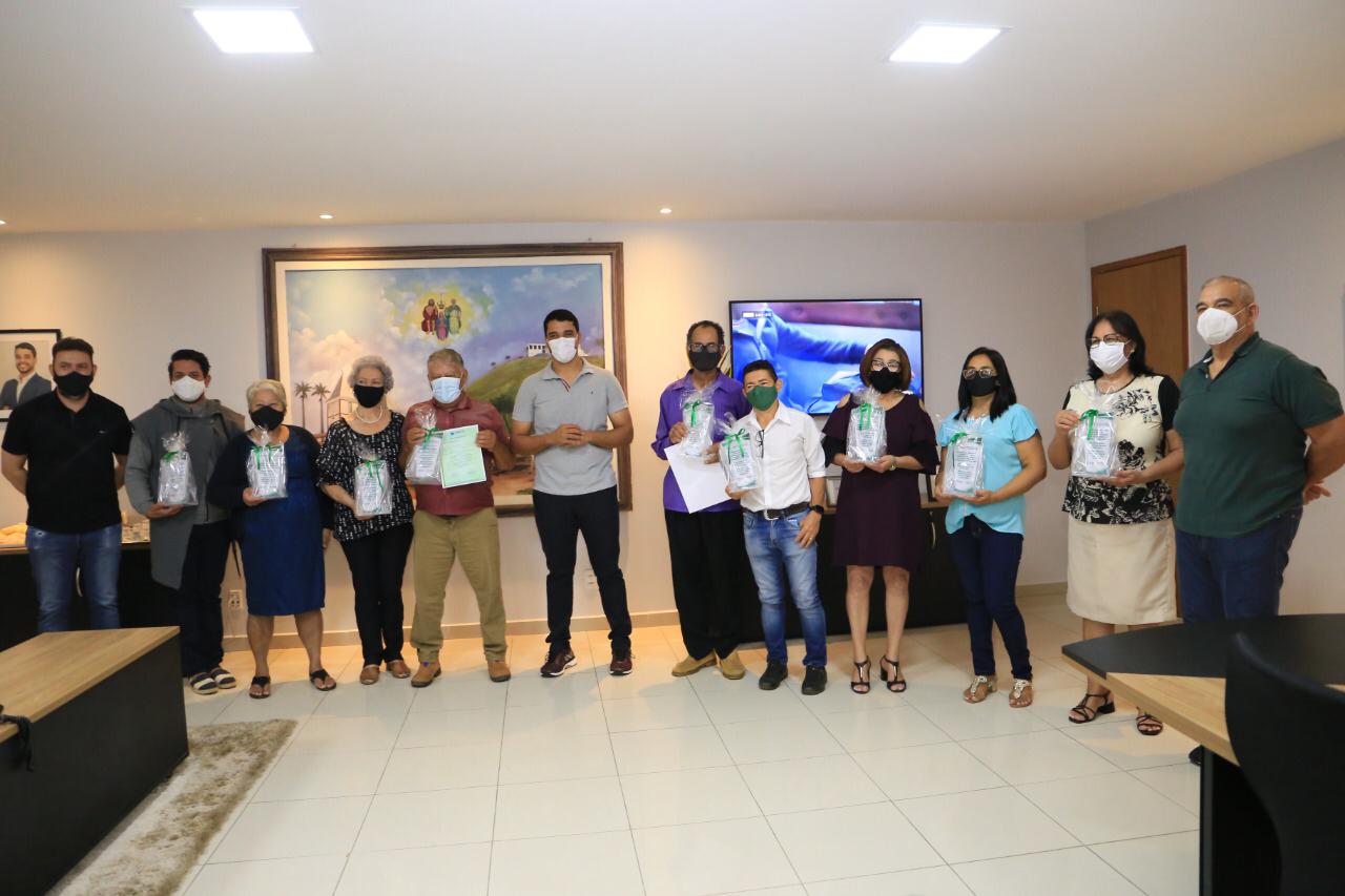 Prefeito Marden Júnior e presidente do TrindadePrev, Mariquita Alves, entregam placas e certificados aos novos aposentados, nesta terça-feira (06/07). Iniciativa simboliza reconhecimento pelos serviços prestados por profissionais ao município
