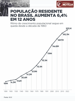 O ritmo de crescimento populacional no Brasil manteve a tendência de queda iniciada na década de 1970 e avançou apenas 6,45% entre 2010 e 2022. Com o menor aumento da história, chega a 203.062.512 o total de residentes em território nacional, segundo dados do Censo Demográfico 2022 revelados nesta quarta-feira (28) pelo IBGE (Instituto Brasileiro de Geografia e Estatística).