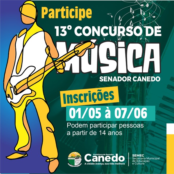 A Prefeitura, através da Secretaria Municipal de Educação e Cultura (Semec), está com inscrições abertas para o 13º Concurso de Música de Senador Canedo com premiação de até R$ 2 mil. Podem se inscrever artistas acima de 14 anos que moram na cidade a pelo menos três meses e que se enquadrem nas seguintes categorias: rock, rap, pop, mpb, religiosa e sertaneja.