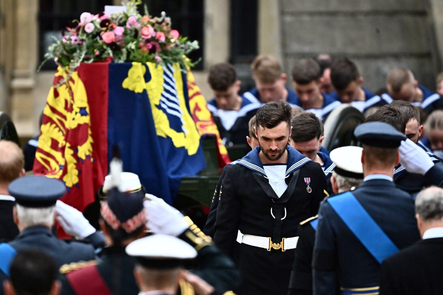 Iniciando o último adeus à monarca mais antiga do Reino Unido, o caixão, coberto com a coroa, o cetro e o orbe – símbolos da rainha -, foi transferido em um carro da Royal Navy puxado por dezenas de marinheiros.