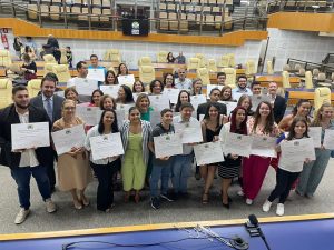 A vereadora Sabrina Garcez realizou na tarde de sexta-feira (19/5), no plenário da Câmara Municipal de Goiânia, uma sessão solene em homenagem aos alunos, professores e diretores medalhistas e menções honrosas da Secretaria Municipal de Educação de Goiânia nas Olimpíadas de Matemática da Rede Pública do Brasil em 2022 (Obmep).