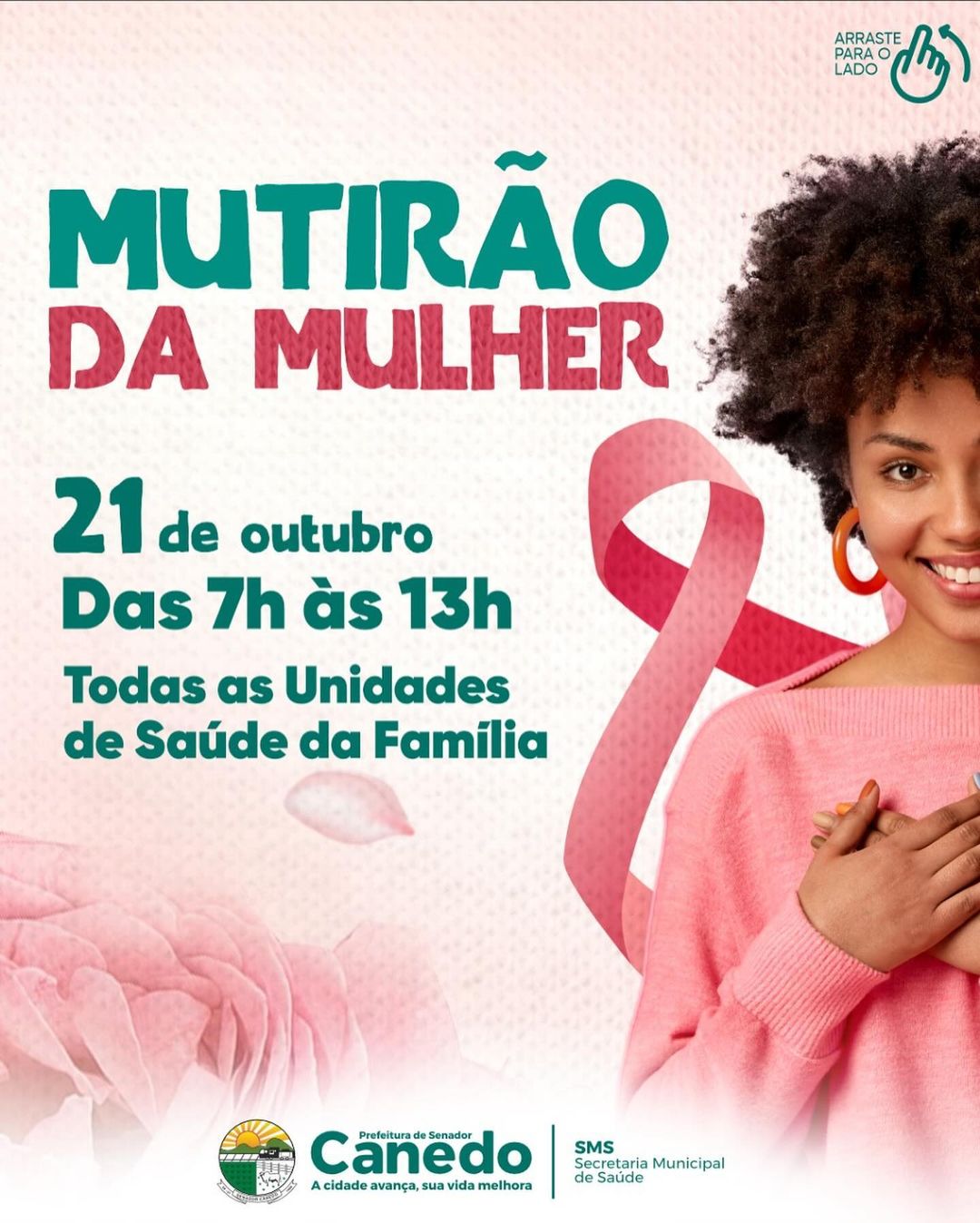 No próximo sábado, 21, a Prefeitura de Senador Canedo, por meio da Secretaria de Saúde, vai abrir todas as Unidades de Saúde da Família estarão abertas das 7h às 13h para oferecer às mulheres da cidade, a oportunidade de cuidar da saúde durante o “Mutirão da Mulher”. Esta iniciativa é parte integrante da campanha Outubro Rosa, que visa a conscientização e prevenção do câncer de mama.