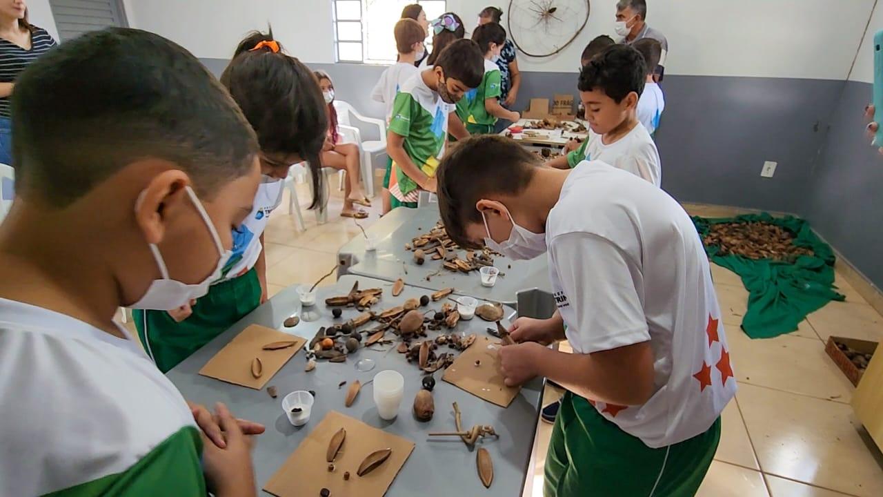 Elas fizeram montagem de animais e cenários de vegetação com a colagem de sementes como Baru, Flor do Cedro, Coco de Bacuri, Timbi, caroço de azeitona, pata de vaca, entre outras. Corujas, hienas, emas, flores, mini-árvores do Cerrado surgiram a partir do imaginário infantil despertado pelas aulas e o contato com as sementes.